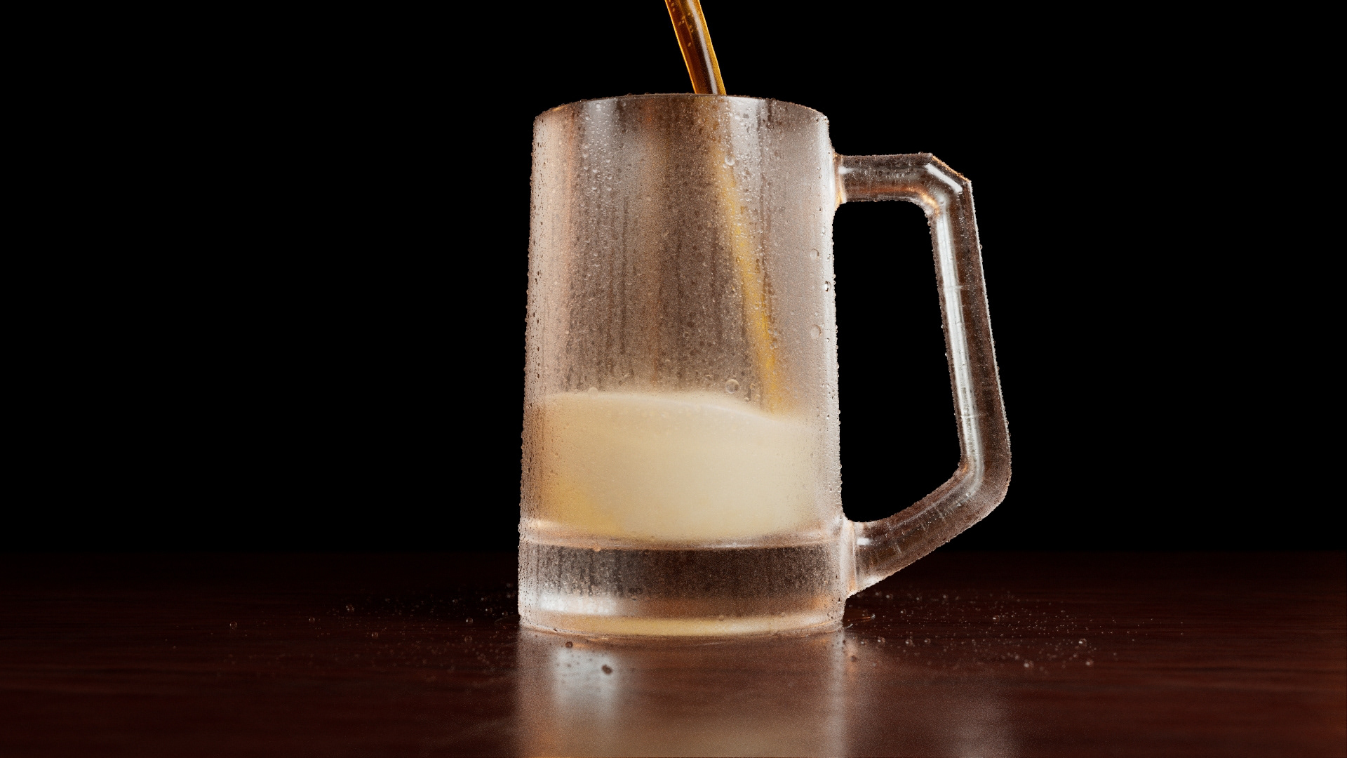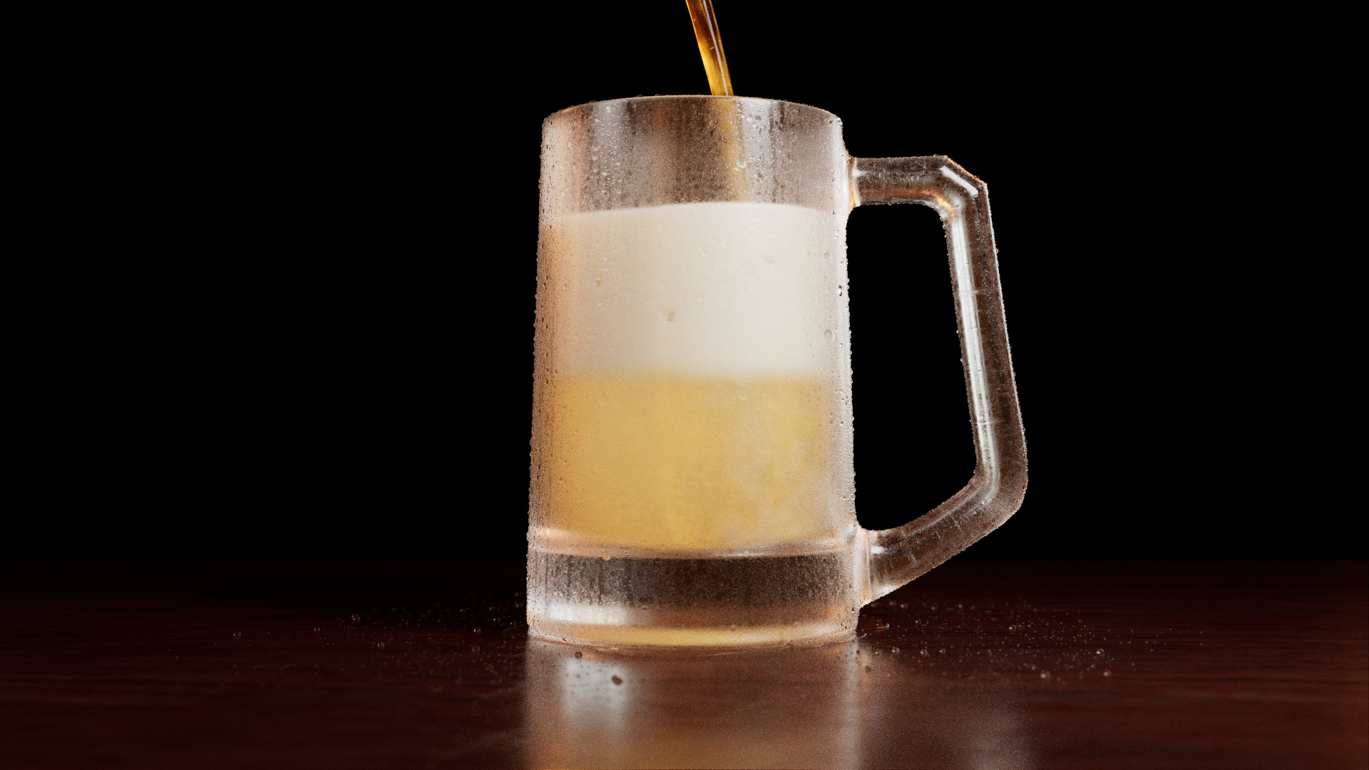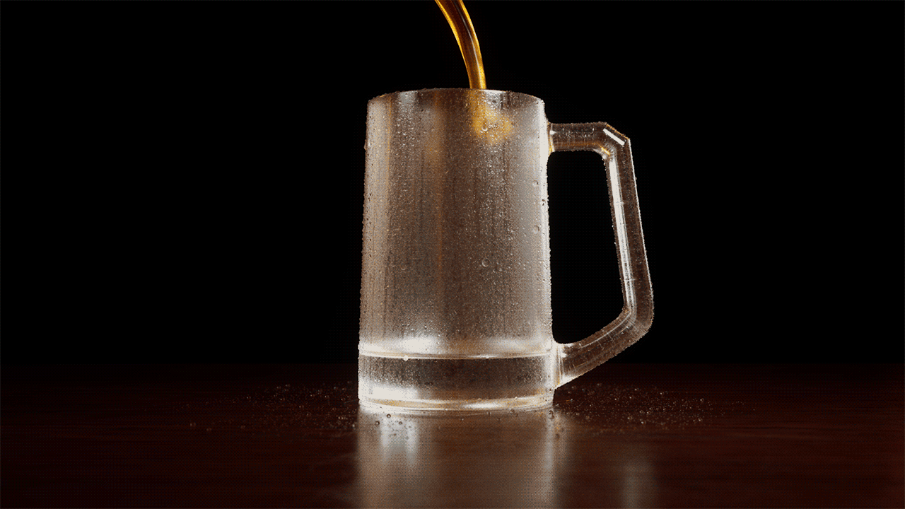 The piece explores the behavior of beer being poured into a glass, addressing key elements such as fluid dynamics, foam formation, glass interaction, and subtle details including condensation, bubbles, and lighting response.