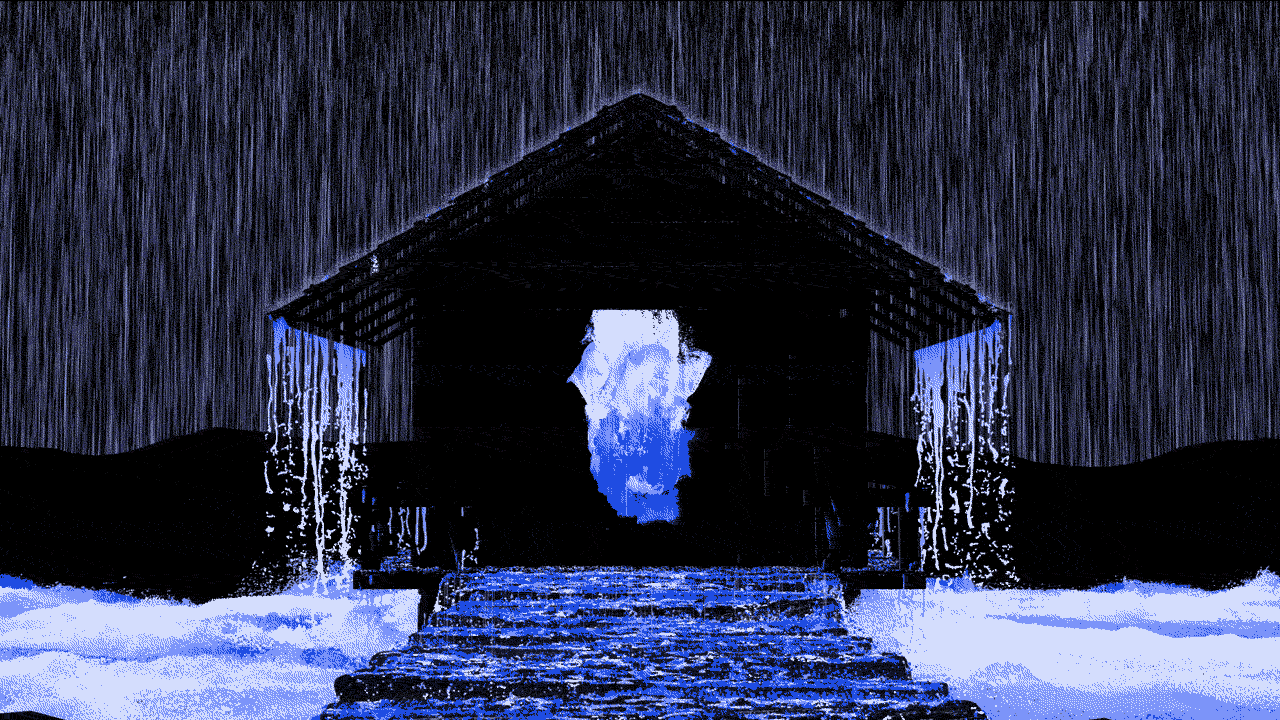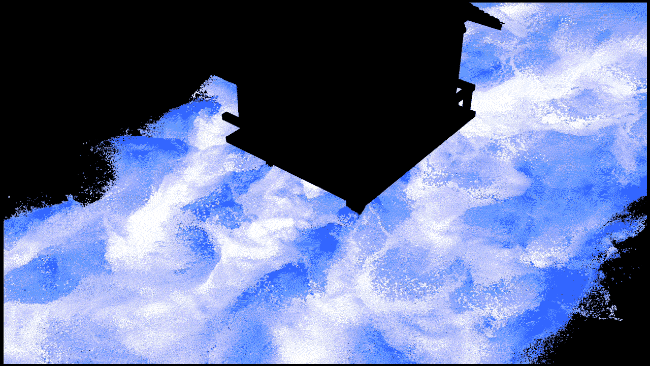 This cinematic shot explores large-scale water simulations driven by turbulent river forces, combined with procedural rain and particle effects.